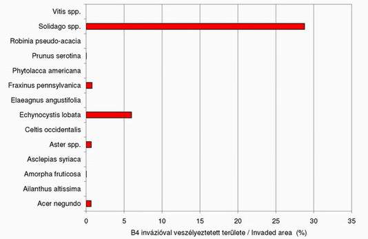 37% of its area is endangered by plant invasion, especially by goldenrod species (Solidago spp.). Other alien species – excepting wild cucumber (Echynocystis lobata) – only rarely occur in this habitat. Its stands in the south-west Transdanubia are highly endangered by plant invasion, while there are less threatened stands in the Great Hungarian Plain.