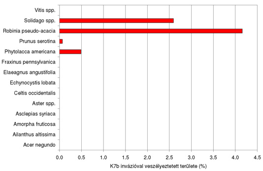Only 9% of its area is endangered by plant invasion. Black locust (Robinia pseudoacacia) and goldenrod species (Solidago spp.) are the most frequent invasive plants, but fortunately, even they threat only few portions of stands.