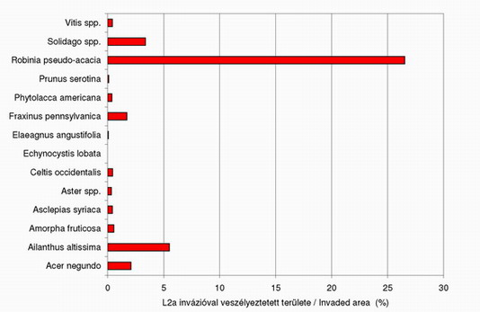 50% of its area is endangered by plant invasion, but there is a high spatial variation in the cover of alien species. The most important alien species is the black locust (Robinia pseudoacacia), and tree of heaven (Ailanthus altissima) reaches considerable cover.