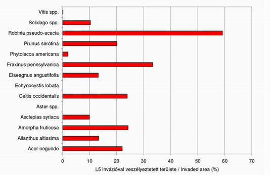 67% of its area is endangered by plant invasion. Almost all stands are threatened by plant invasion. The most important alien species is the black locust (Robinia pseudoacacia), but it is often invaded by green ash (Fraxinus pennsylvanica), common hackberry (Celtis occidentalis), boxelder (Acer negundo) and black cherry (Prunus serotina), too.