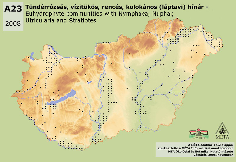 More or less closed communities of large, rooted aquatic plants with decorative generative organs above the water level. It is a sporadic, rare habitat type (900 ha) in oxbow lakes, in greater canals and extensive fish ponds. Far from the rivers it becomes infrequent. The habitat type is the most common on Tiszai-Alföld (580 ha), especially in Bodrogköz and on Szatmár-Beregi-sík (here almost 400 ha), sporadic on Dunai-Alföld (110 ha), where it mainly occurs on Duna- and Dráva-sík. Uncommon on Kisalföld (10 ha), on Nyugat-Dunántúl (28 ha), in the Dunántúli-középhegység (2 ha) and in the Északi-középhegység (17 ha), as well as in the Dunántúli-dombság (although it covers 150 ha, most of it is in Kis-Balaton).