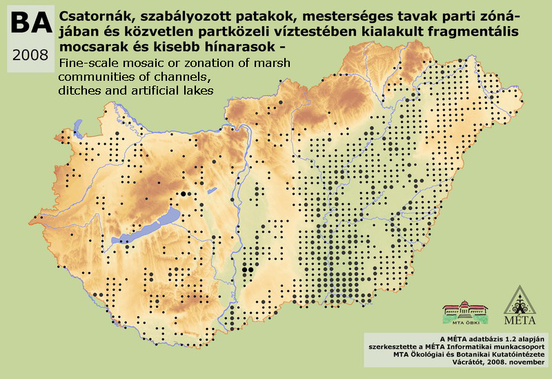 Marshes of channels for irrigation and for draining inland waters, artificially canalized streams, streamlets and artificial standing waters (fish ponds, reservoirs, mine pits, irrigation pits). This habitat includes both the waterside marsh vegetation (reed, sedge, Alisma, Glyceria etc. beds) and the aquatic vegetation, respectively. It can have marshy, fen and saline character. We mapped this vegetation mosaic as a complex habitat, because the mapping of the constituting habitats would have been impossible at the scale of the MÉTA program. Its total area is 11000 ha in Hungary, but we consider it as an underestimation, since, as it is obviously visible on the map, not all mappers used this category. It is most frequent on Tiszai-Alföld (6900 ha) and on Dunai-Alföld (3300 ha), in the drainage channels of former floodplains. It is sporadic on Kisalföld (210 ha) and in the Dunántúli-dombság (650 ha), rare on Nyugat-Dunántúl (60 ha), in the Dunántúli-középhegység (110 ha) and in the Északi-középhegység (120 ha).