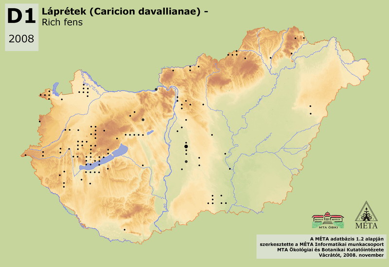 Developing on basic rich, mainly calcareous, constantly wet soils, rich fen meadows usually have a shortgrass, sometimes tussocky character. Soil water surface is close to the soil all year round (in tussocky stands periodically can be higher). The dominant species are: Carex davalliana, C. lasiocarpa, Eriophorum angustifolium, E. latifolium, Juncus subnodulosus, Menyanthes trifoliata, Schoenus nigricans, Sesleria uliginosa (S. caerulea). The total area of the habitat is around 350 ha in Hungary. It covers larger areas only on Duna-Tisza köze (250 ha, mainly the transitional Schoenus type). Relatively more, yet small stands can be found in the 60 km range of the western part of Lake Balaton (60-70 ha in the western part of the Dunántúli-középhegység, eastern part of Nyugat-Dunántúl, and southern part of Kisalföld). It appears scarcely in the Északi-középhegység, in Hanság and in the range of the western border (Sopron, Kőszeg, Őrség, Vendvidék). This habitat is adapted to the constant water supply, and often to the cool-cold microclimate; the continuous failure of the water supply threatens several stands even at the present time. The drying leads to uncharacteristic forms, or to other vegetation types (Molinia meadows – D2, Mesotrophic meadows – D34, Uncharacteristic grasslands – OB, OC). As a consequence, the identification of the remnant stands can not be always certain.