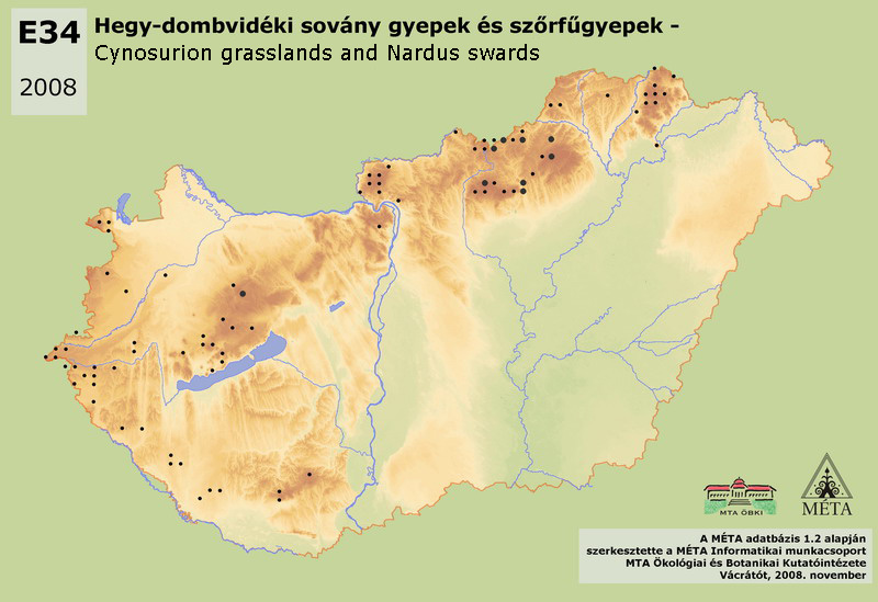 Theses grasslands (occurring in humid collin-submontane regions on nutrient-poor, acid soils) developed due to the cutting and grazing of former forests. This acidofrequent grass vegetation is dominated by acidofrequent-mycotrophic, low or medium-tall grasses with good sprouting ability; Agrostis capillaris, Festuca rubra agg. F. nigrescens, Sieglingia (Danthonia) decumbens, Festuca ovina, F. filiformis, Nardus stricta. Its actual area in the country is around 600 ha. It occurs mainly in the higher or cooler mountains of the Északi-középhegység (Sátor-hegység, Bükk, Mátra, Heves-Borsodi-dombság, Medves, Börzsöny) (cca. 500 ha). There are sporadic occurrences in the western part of the Dunántúli-középhegység, on Nyugat-Dunántúl and Dunántúli-dombság.