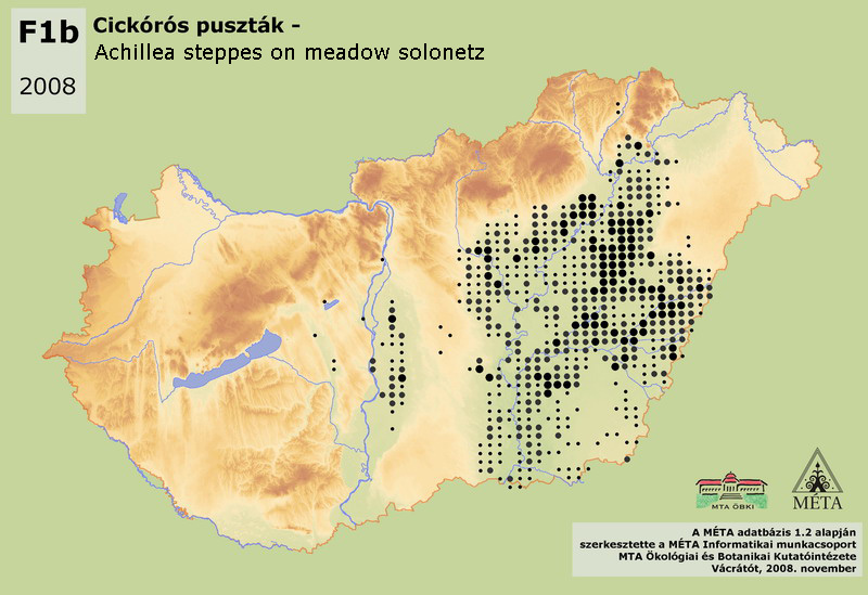 Low or high, species poor habitat, generally dominated by Festuca pseudovina and Achillea species (A. setacea and A. collina) and other pseudohalophytic species, dry grassland species and meadow generalist species (usually poor in Achillea asplenifolia and stenohalophytic species). It occurs on former floodplains or on leached saline pusztas. The total actual area of the habitat is almost 46000 ha. It is quite rare west from Duna River and in the Északi-középhegység (except the occurrences around Szerencs, altogether a few hectares). There are transitional stands towards degraded loess or sand steppes on Duna-sík (1750 ha). In turn, stands in Kiskunság occur on the place of dried-out Molinia meadows, and also have transitional character (similarly to the Nyírség). 96% of the stands are on Tiszai-Alföld, within that on the phytogeographical Tiszántúl (Crisicum, 44000 ha). Achillea salt steppes have the largest extension on Hortobágy and on Körös-vidék, but they occur sporadically in all saline regions. Most of the stands developed as a consequence of the drainages of the 19th century, but we presume the existence of older stands that developed in a natural way (Molnár and Borhidi 2003).