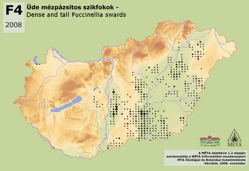 Grasslands with meadow character, the cover of perennial plants is higher then 50%. This habitat develops on strongly saline soils, and usually has water cover for a longer period in the year (wet in springtime but sometimes completely dry in summer or just the opposite: flooded by summer thunderstorms). Dominant species are: Puccinellia limosa, P. festuciformis subsp. intermedia, Carex divisa. The differentiation from the next (F5) habitat is often arbitrary (the proportion of perennial plants is minimum 50% in case of F4). Their total actual area is 7000 ha in Hungary. They are most frequent on Dunai-Alföld (3670 ha), mainly on the lower part of the eastern slopes of Duna-Tisza köze (approx. 1500 ha), and on Duna-sík (approx. 1900 ha), but uncommon on Mezőföld (along Sárvíz). The habitat is also common on Tiszai-Alföld (3300 ha, e.g. Hortobágy, Bihari-sík and Körös-vidék, Körös-Maros köze, Gerje-Perje-sík), though a certain part of the stands (except Nyírség) rather belongs to the next habitat (F5) (Puccinellia stands on solonetz are typically shorter and less dense). It occurs more sporadically on Heves-Borsodi-sík and on Bihari-sík, as well as on the partly secondary saline regions on the southern part of Tiszántúl. It is especially rare in Kisalföld (6 ha, around Lake Fertő). Except some marginal occurrences (a few hectares in total), it is absent from the Dunántúli-dombság, from Nyugat-Dunántúl, from the Dunántúli- and the Északi-középhegység. Puccinellia swards are in the middle of the saline zonation, their sites have high salt content, at the same time they are wet or moist almost year-round. Consequently, they are sensitive to leaching, hence their total area is decreasing everywhere in the country.