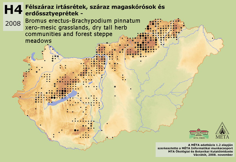 Xero-mesic clearings, grasslands, sometimes tall herb communities belong to this habitat type with variable origin and species pool. These grasslands are dominated mainly by grasses of broad leaves, such as Bromus erectus and Brachypodium pinnatum, more infrequently Arrhenatherum elatius, Bromus pannonicus, Stipa tirsa, Sieglingia (Danthonia) alpina. This habitat is rich in species, also in forbs, and holds forest remnant forest species. The actual extension is 12 000 ha, the two-third of that can be found in the Északi-középhegység (8000 ha). It occurs in several places, but with much smaller area (2700 ha) in the Dunántúli-középhegység, and sporadically in the eastern part of Dunántúli-dombság (700 ha), northern part of Nyugat-Dunántúl (280 ha), and in the western part of Alföld (Mezőföld, 300 ha). It can be found in small amount also on Kisalföld, in the western part of Dunántúli-dombság, and in the northern part of the Duna-Tisza köze. It is mainly a colline habitat type, which is rare in the lowlands, occurring most typically in regions of dry, forest steppe climate, often under subcontinental influence. Whereas it is absent from Alföld, which is the driest part of the country – but this can be explained, at least partially, by the land-use history of lowland steppe landscapes (ploughing all the areas suitable for agriculture). It is relatively easy to identify this habitat, but sometimes the separation from other dry steppes (H3a, H5a), or from certain meadow types (E1) can be problematic.