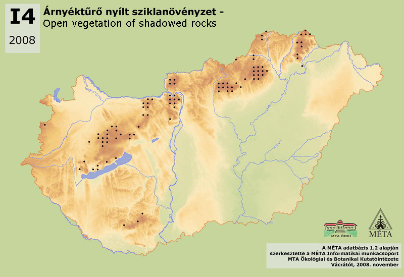 These, characteristically open, mesic, pioneer communities – often with well-developed moss layer – occur on shadowed rock outcrops, rock cliffs, screes, periglacial block streams (usually facing to the north). The abiotic parameters and the lack of the soil do not offer suitable conditions for the mass spread of perennial grass, shrub, and tree species, and in this way neither to the evolution of rock grasslands, thickets and forests. Due to the occurrences on rock cliffs, the extension of the habitat can hardly be interpreted; consequently, for this habitat also the frequency of occurrences is a better descriptor of its distribution than the extension in hectare. It is most common in the Északi-középhegység (190 occurrences), it can be found with the greatest number in Bükk, Mátra, Sátor-hegység and Börzsöny, but occurs also on Aggteleki-karszt and on the Heves-Borsodi-dombság. More infrequent in the Dunántúli-középhegység (approx. 60 stands), mainly in the highest parts (Bakony, Pilis, Visegrádi-hegység), and very rare in other regions (Keszthelyi-hegység, Balaton-felvidék, Gerecse, Budai-hegység). There are some stands in Mecsek, and only one stand was found in the Kőszegi-hegység.