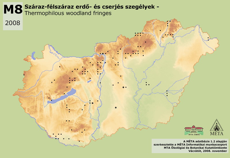 A complex habitat; a community of the fringes of dry and semi-dry forests and thickets, and the connecting steppes. Xerofrequent and mesofrequent herbs are equally typical. The concentrated presence of the so-called forest steppe species, e.g. Geranium sanguineum, Iris variegata, Dictamnus albus, Trifolium species) is also characteristic. The maximal closure of the shrubs remains under 60%. Thermophilous woodland fringes usually develop as real fringes, but occasionally can also form larger patches independent from the forest. According to our recent estimation its total area is around 350 ha in Hungary. As a (forest-)thicket-steppe mosaic the estimation of its exact area is difficult. Moreover, its interpretation is not uniform; hence there might be some further occurrences. Occurring mostly in the central and eastern part of the country, it is most frequent in the eastern part of Dunántúli-középhegység (mainly Keleti-Bakony, Vértes, Budai-hegység, Pilis) and in the Északi-középhegység (mostly Cserhát, Mátra, Bükk, Heves-Borsodi-dombság, Sátor-hegység). It can be found in the eastern part of Dél-Dunántúl, at the edges of Alföld, and sporadically and in simplified variants also in the inner part of Alföld (e.g. Duna-Tisza köze, Nagykunság, Körösvidék). Connected to dry and warm climate, the habitat is almost missing from the humid, western part of the country. Presumably historical causes, the cutting of dry forests explain the absence of the habitat from the majority of Alföld.