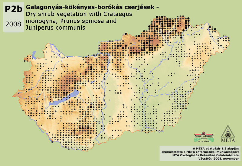 Mostly secondary shrublands or shrubland-grassland mosaics of dry and warm areas, dominated by Crataegus monogyna and/or Prunus spinosa, more infrequently by Juniperus communis. The closure of the shrub vegetation reaches 50%, and within this, the ratio of trees is under 50%. The total area of the habitat is almost 40000 ha in Hungary. It occurs with the greatest extension (23000 ha) in the hilly lower parts and on the foothills of the Északi-középhegység. The habitat is also frequent in the Dunántúli-középhegység (5000 ha), and on Dél-Dunántúl (6000 ha, mainly in its south-eastern part). Also many occurrences are known from Alföld (4000 ha), from Nyugat-Dunántúl (1000 ha) and from Kisalföld (400 ha). This dry shrub vegetation is connected to land-use changes; it develops especially on those man-made (semi-)dry grasslands that were formerly grazed and/or mowed, and their use was later abandoned.