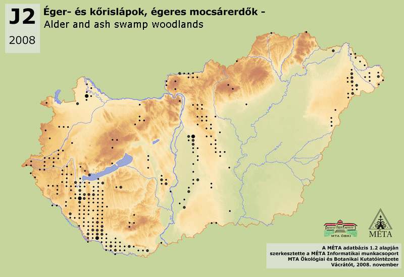 Forest dominated by Alnus glutinosa or partly by Fraxinus angustifolia subsp. pannonica on peat or peaty soils. This habitat is rich in mire species (e.g. Thelypteris, Carex elata) and is usually waterlogged also in summer. Their water is constantly stagnant, or moving slightly only in rainier periods (marsh forests). Dried-out and drying stands with changed water supply also belong to this habitat type. In contrast to riverine ash-alder woodlands they are poor in species of oak-hornbeam and beech forests. The most frequent swamp forest type of Hungary; its actual area is around 3600 ha. More than its half can be found in the Dunántúli-dombság (1450 ha), but large stands occur also on Dunai-Alföld (950 ha), especially on Dráva-sík and Turjánvidék. It covers 570 ha on Kisalföld, mainly in Hanság. On Tiszai-Alföld (300 ha) it is common only on Nyírség and Szatmár-Beregi-sík. It is sporadic in the Északi-középhegység (180 ha), on Nyugat-Dunántúl (165 ha), rare in the Dunántúli-középhegység (7 ha). It is independent from the macroclimate; its distribution refers mostly to the water conditions. Many stands are alder plantations on the places of sedge communities. The classification of these transitional stands is uncertain.