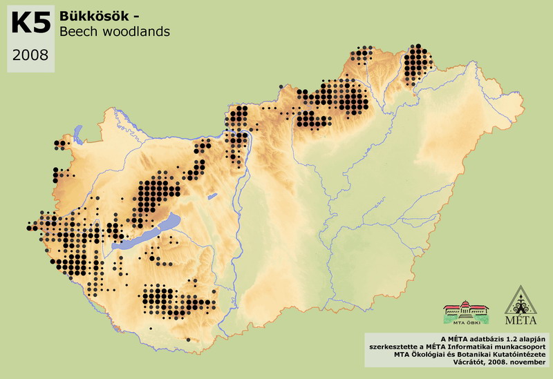 High-growing (in mature state 20–35 m high), closed (canopy closure: 80–100%), mesic forests, with beech monodominace (>60%), and with species of mesic forests in the herb layer. They cover 110000 ha altogether in the country. The habitat occurs with the greatest extension in the Északi-középhegység (45000 ha, frequent in the mountains of Bükk, Mátra, Börzsöny and Sátor-hegység, rather sporadic in Cserhát, and missing from Cserehát and from the Gödöllői-dombvidék). It covers also large areas in the Dunántúli-középhegység (30000 ha, mainly in Bakony, also frequent in the Pilis and in the Visegrádi-hegység and in the north-western part of Vértes, missing from the Velencei-hegység), on Nyugat-Dunántúl (22000 ha, Soproni- and Kőszegi-hegység, Kemeneshát, Őrség, Vendvidék and Zalai-dombság), and in certain parts of Dél-Dunántúl (12500 ha, with larger extension in Zselic and Mecsek, and sporadically in Külső- and Belső-Somogy). Nowadays it is actually absent from Alföld (only very small stands occur on Dráva-sík). Beech woodlands are connected to cool and humid climate. In regions with less favourable environment (too dry) for beech and/or under strong human impact the habitat is gradually withdrawing (e.g. Cserhát, Külső- and Belső-Somogy, northern slopes of the Dunántúli-középhegység). It is easy to recognize and interpret this habitat; only those stands can cause problems that consist of less beech and more associate tree species (hornbeam, ash) and create transitions to other mesic forests (K2, K1a, etc.). Where these transitional stands cover larger areas mixed with stands of beech dominance, the estimation of the habitat extension can be uncertain (especially in the southern and western part of Dunántúl).