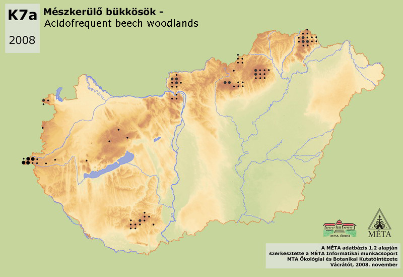 Low or medium-high growing, closed forests growing in the beech zone, on extremely acid, mainly shallow soils. The tree layer is dominated by beech, the shrub layer is absent, the herb layer is composed of acidofrequent forest species [Luzula luzuloides, Deschampsia (Avenella) flexuosa, Vaccinium myrtillus, etc.], and the moss layer is occasionally significant. It is a rare habitat; the total area is less than 1300 ha. It occurs with the greatest amount in Őrség and Vendvidék (800 ha). There are some extended occurrences in the higher regions of the Északi-középhegység (350 ha, Börzsöny, Mátra, Bükk, Sátor-hegység). Sporadic in Mecsek (30 ha), in the Soproni- and Kőszegi-hegység (altogether 50 ha). Only small stands can be found in the Dunántúli-középhegység (Bakony, Visegrádi-hegység).
