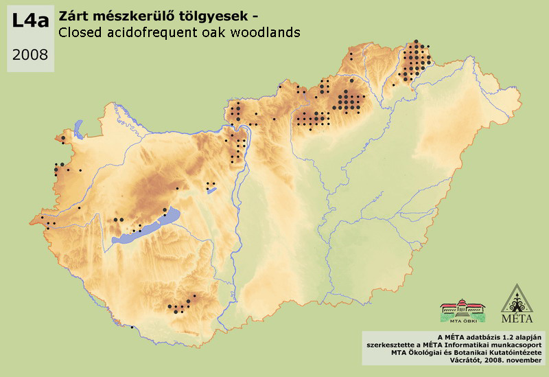 Low or medium high growing, closed forests in the oak and beech zone, developed on extremely acid soils. Submontane habitat type, connected to acid bedrock (andesite, rhyolite, granite, acid sandstones, shales) and to shallow, dry soils, occurring mainly on south slopes. The dominant tree species is Quercus petraea, the shrub layer is missing, the herb layer is characterised by acidofrequent forest species [Luzula luzuloides, Deschampsia (Avenella) flexuosa, Vaccinium myrtillus, etc.], the moss layer can be significant. The total area of the habitat is 2300 ha in Hungary. The greater part of the occurrences is in the higher regions of the Északi-középhegyég (Sátor-hegység, Bükk, Mátra, Heves-Borsodi-dombság, Börzsöny). There are some sporadic occurrences in the Dunántúli-középhegység (300 ha, especially in the Visegrádi-hegység, Budai-hegység, Velencei-hegység, and on Balaton-felvidék). It can be found at the western edge of Nyugat-Dunántúl (100 ha, Soproni-hegység, Kőszegi-hegység, Őrség-Vendvidék) and on Dél-Dunántúl, in Mecsek (200 ha). Though it is usually easy to recognize this habitat, there are barely identifiable transitional stands towards turkey oak woodlands (L2a, L2b).