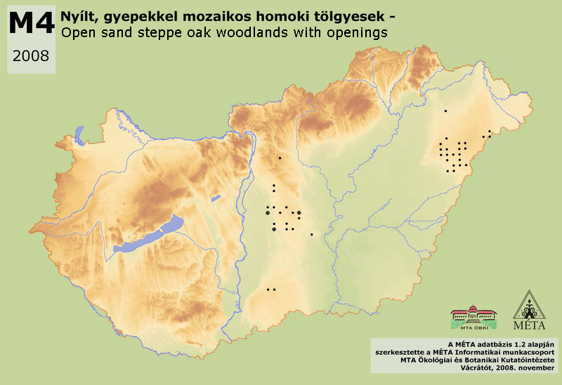 Quercus robur dominated steppe forests of lowland sand regions, appearing in smaller tree groups or in greater stands. They usually form mosaic with dry grasslands. The density of the shrub layer is varying; generally high and closed, while at other sites it forms mosaics with open grasslands. Festuca rupicola and Poa angustifolia are common species of the herb layer. A characteristically lowland habitat, its actual area in the country is only approx. 300 ha; probably one of the most endangered habitats of Hungary. The estimation of its real extension is difficult; only the open sand oak woodlands belong to this group, the closed stands with different species pool and physiognomy should be categorized to closed lowland steppe oak woodlands (L5). Its area was estimated to be approx. 100 ha on Nyírség, and 190 ha in Duna-Tisza köze. As a consequence of systematic planting of Robinia pseudo-acacia in the 20th century, it disappeared from huge areas in both regions. It can be found on the foothills of Vértes and around Győr (approx. 15 ha), as well as in the Gödöllői-dombvidék. It is missing from the Dunántúli-dombság, from Nyugat-Dunántúl and from the Északi-középhegység, since there are no dry sand regions in these landscapes. There are some planted oak tree groups and open oak forests in the southern part of Duna-Tisza köze that can possibly be considered as the uncharacteristic variant of the habitat. These were, however, deleted from the map.