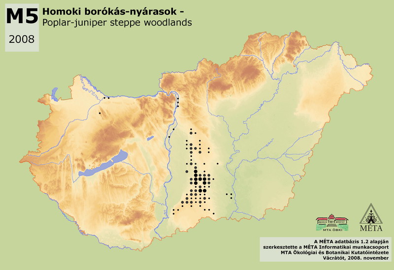 Shrublands or forests dominated by Juniperus communis and/or by Populus alba and P. canescens on the sand regions of Alföld. This species poor, open habitat is typically poor in forest species and forms a mosaic with open sand steppes. Minimal closure of the tree layer is 20%. It occurs characteristically on Duna-Tisza köze, the total actual area is around 3000 ha in Hungary. It is completely missing from Tiszai-Alföld, Nyugat-Dunántúl, from the Dunántúli-dombság and the Dunántúli- and Északi-középhegység, and there are only fragmented stands on Kisalföld (approx. 10 ha). Presumably it is extinct from Mezőföld. Poplar-juniper steppe woodlands are widespread in Duna-Tisza köze, most of the stands can be found in its southern part. Because of the smaller grain size of the sand and the rarity of sand dune regions, the habitat is rare on the eastern gentle “slope” of Duna-Tisza köze; these stands are partly planted native poplar woodlands with spontaneous openings.