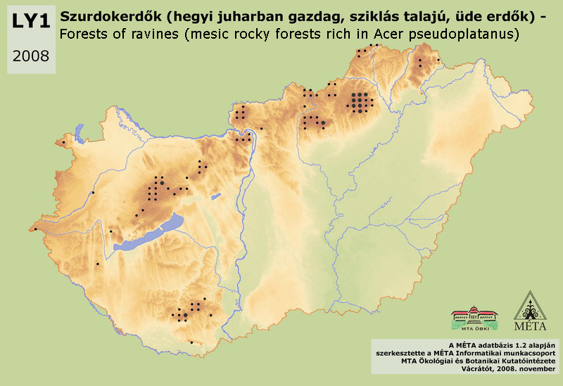 Forests of ravines are submontane, rocky habitats with rock streams, connected to cool, humid climate, occur generally on limestone in Hungary, on steep slopes of rock debris (or in the bottom of the valleys), with leaking water and rock outcrops. Fraxinus excelsior, Acer platanoides, A. pseudoplatanus are the most characteristic tree species of this high-growing (20-30 m) forest. Beech, Ulmus and Tilia species are frequent associate species. This is an infrequent habitat; its total area is less than 500 ha in the country. It reaches the largest extension in the Északi-középhegység (approx. 350 ha), especially in Bükk and Mátra, but sporadically in Börzsöny, around Medves, in the Heves-Borsodi-dombság and on Aggteleki-karszt. Among the mountains of the Dunántúli-középhegység it can be found with larger amount only in Bakony (approx. 50 ha), while it is sporadic at other places (Pilis, Visegrádi-hegység) or has uncertain occurrence (Vértes, Keszthelyi-hegység). There are a few stands in Mecsek (60 ha). A variant of the habitat developed in the steep loess valleys can be found in Zalai-dombság and in Őrség. Separation from other habitats of rocky soils [LY2, LY3] can be occasionally uncertain.