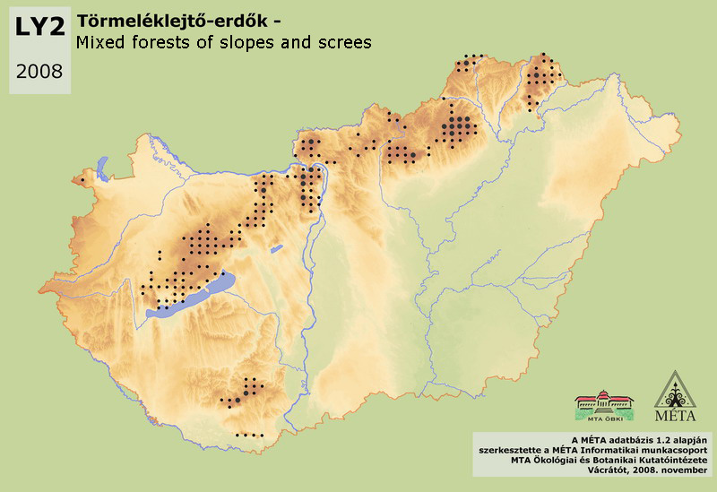 These mesic or semi-dry submontane habitats develop on steep, detrital, rocky slopes and screes, occurring on calcareous and silicate bedrock alike, but preferring the former one. Tilia species are prevalent, mixed with Fraxinus and Acer species, sometimes with beech and/or Quercus petraea. Nitrophytes are typical in the herb layer. The total area of the habitat is around 1700 ha. It is a rare but widespread habitat in the Északi- and in the Dunántúli-középhegység (1000 and 500 ha, absent: Cserehát, Putnoki-dombság, Heves-Borsodi-dombság, Velencei-hegység, infrequent: vicinity of Medves, Cserhát). It also occurs in the mountains of Dél-Dunántúl (200 ha, Mecsek, Villányi-hegység). Occasionally its differentiation from ravine woodlands [LY1] or from mixed relic oak woodlands [LY4] can be difficult.