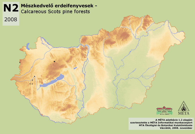 Open relic calcareous Pinus sylvestris forests with calcifrequent herb layer are connected to the calcareous bedrock (sand, sandstone, limestone phyllite) and to the locally drier habitats in a relatively wet climate. The total area of this rare habitat is around 60 ha, 45 ha out of that are on Bakonyalja, between Fenyőfő and Bakonyszentlászló. The rest can be found on Nyugat-Dunántúl, in the northeastern part of the Zalai-dombság and in the Kőszegi-hegység.