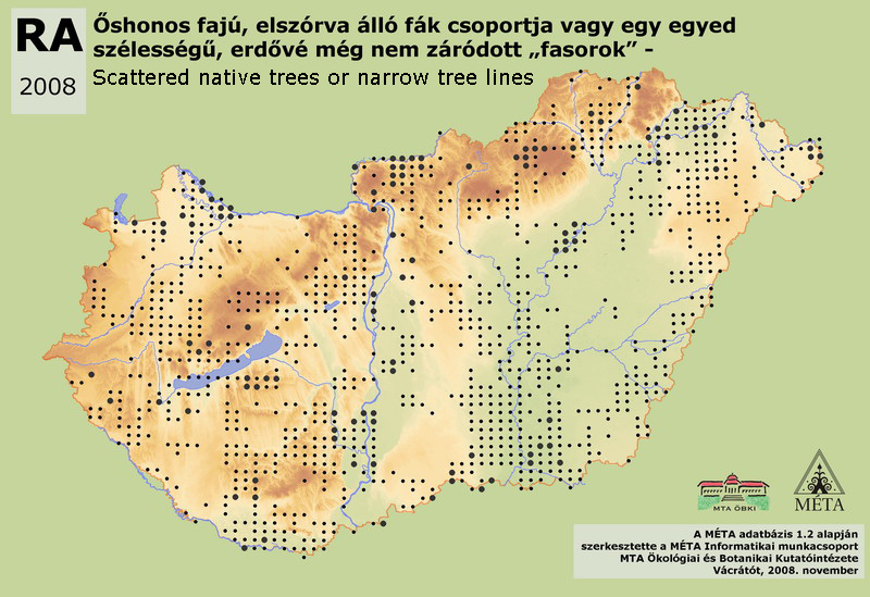 Groups of scattered native trees (willows, oaks etc., occasionally fruit trees, walnut, Populus nigra var. italica) on grasslands and in marshes; or narrow tree lines and forest belts (1-2 tree width). The tree group should have at least 5 tree individuals, with a minimum diameter of 25 cm at breast height. The total area of the habitat is 6500 ha in the country, with sporadic, but almost even distribution. It covers the largest area on Alföld (more than 3000 ha). More than 1000 ha can be found in the Északi-középhegység, almost 1000 ha on Dél-Dunántúl, and almost 600 ha on Kisalföld. It is most infrequent on Nyugat-Dunántúl and in the Dunántúli-középhegység (approx. 350–350 ha).