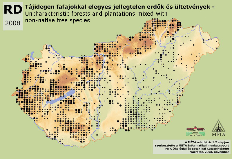 RD – Uncharacteristic forests and plantations mixed with non-native tree species:Planted or spontaneous forests with 50–75% mixture ratio of non-native trees. The habitat is generally widespread in the country, but most stands are not even semi-natural (except especially the stands of Nyugat-Dunántúl and Északi-középhegység). There are a lot of false RD data of Robinia stands in the database. At the same time there are semi-natural stands erroneously mapped as this habitat type on Nyugat-Dunántúl with a lot of forest species in the herb layer and with high mixture ratio of Picea abies and Pinus sylvestris in the tree layer.