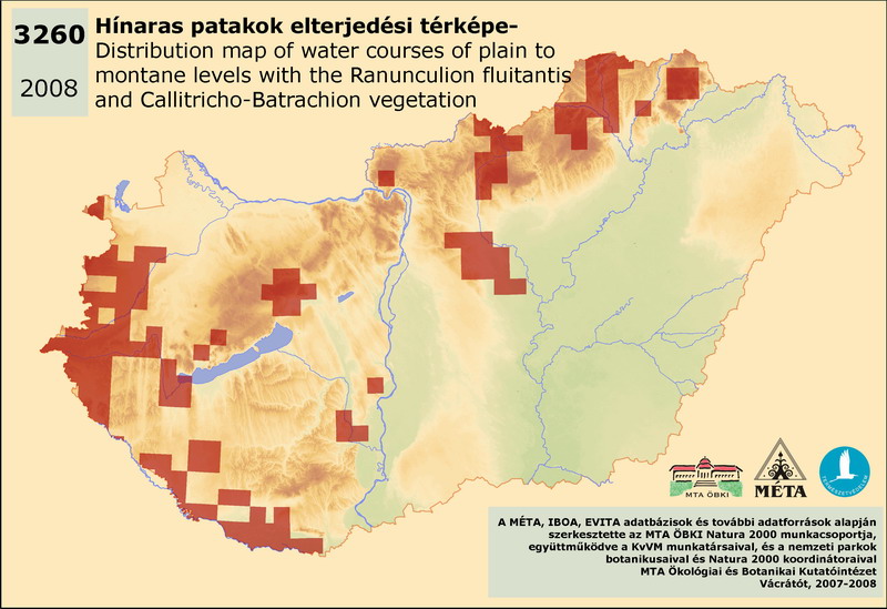 Gyors folyású, tiszta patakok vagy folyók elsősorban Ranunculus fluitans, Callitriche spp., R. aquatilis, R. circinatus és vízimohafajok előfordulásaival. Az ÁRAMLÓVÍZI, (NAGYLEVELŰ) BÉKASZŐLŐS, TÜNDÉRFÁTYLAS HÍNÁR (A3a) egy igen kicsiny része tartozik ide. |